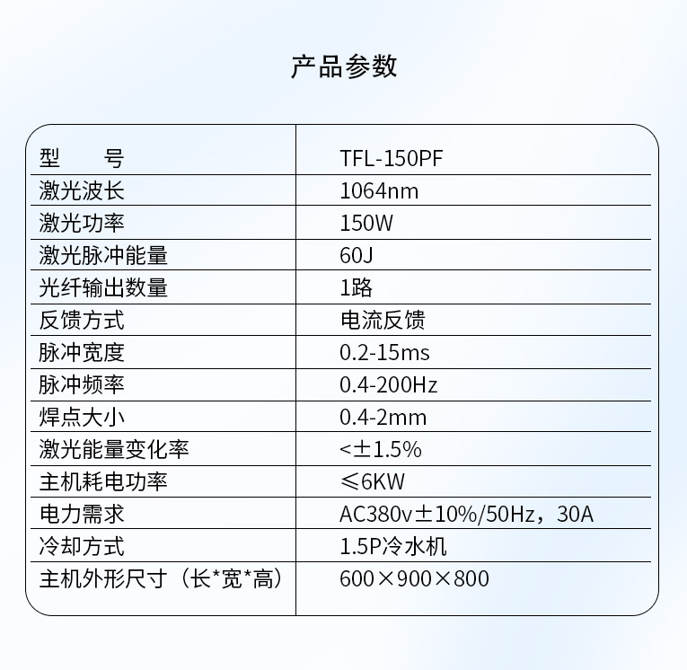 通發(fā)激光TFL-150PF光纖激光焊接機(jī),采用能量反饋控制模式,能量較穩(wěn)定,光纖傳輸光束質(zhì)量好,適合0.5mm以下金屬不銹鋼板材的精密激光焊接,是批量五金產(chǎn)品中小功率焊接專用機(jī)型。