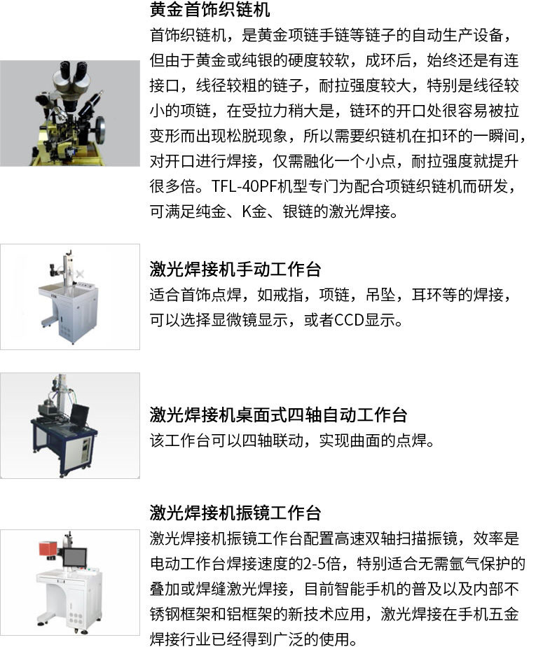 通發(fā)激光研發(fā)針配合黃金織鏈機(jī)、K金制鏈機(jī)、首飾制鏈機(jī)的TFL-80PF自動(dòng)激光焊接機(jī),焊接機(jī)采用能量反饋技術(shù),光點(diǎn)穩(wěn)定,能量強(qiáng)勁,實(shí)現(xiàn)一環(huán)一焊的功能,確保金鏈的耐拉強(qiáng)度。本激光焊機(jī)實(shí)現(xiàn)了水冷一體的小型化結(jié)構(gòu)。適用于各種生產(chǎn)場(chǎng)所。